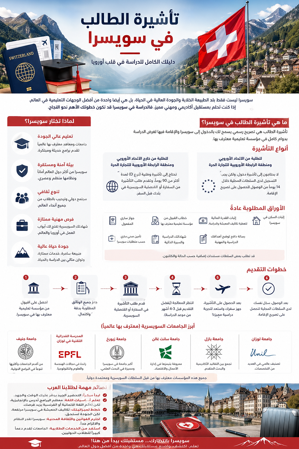 في النهاية، تأشيرة الطالب في سويسرا ليست مجرد ورقة للسفر، بل هي بداية رحلة تعليمية مهمة. ومع التخطيط الجيد، والاختيار الصحيح للمؤسسة، والالتزام بالقواعد، يمكن للطالب أن يبدأ طريقه في سويسرا بثقة وهدوء وتفاؤل.